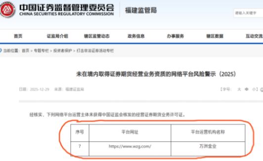 近日香港贵金属交易平台“万洲金业”因其资质与内地合法性引发争议,据悉“万洲金业”存在资质合法二元性,其具备香港合法交易牌照但不具备内地金融牌照,因此其在港运营合法,而借助互联网平台涉足内地招商揽客可能被定性为“非法”。经查询中国证监会官网关于打击非法证券活动通报一栏,“万洲金业”赫然在列,被证监列入高风险黑名单!
